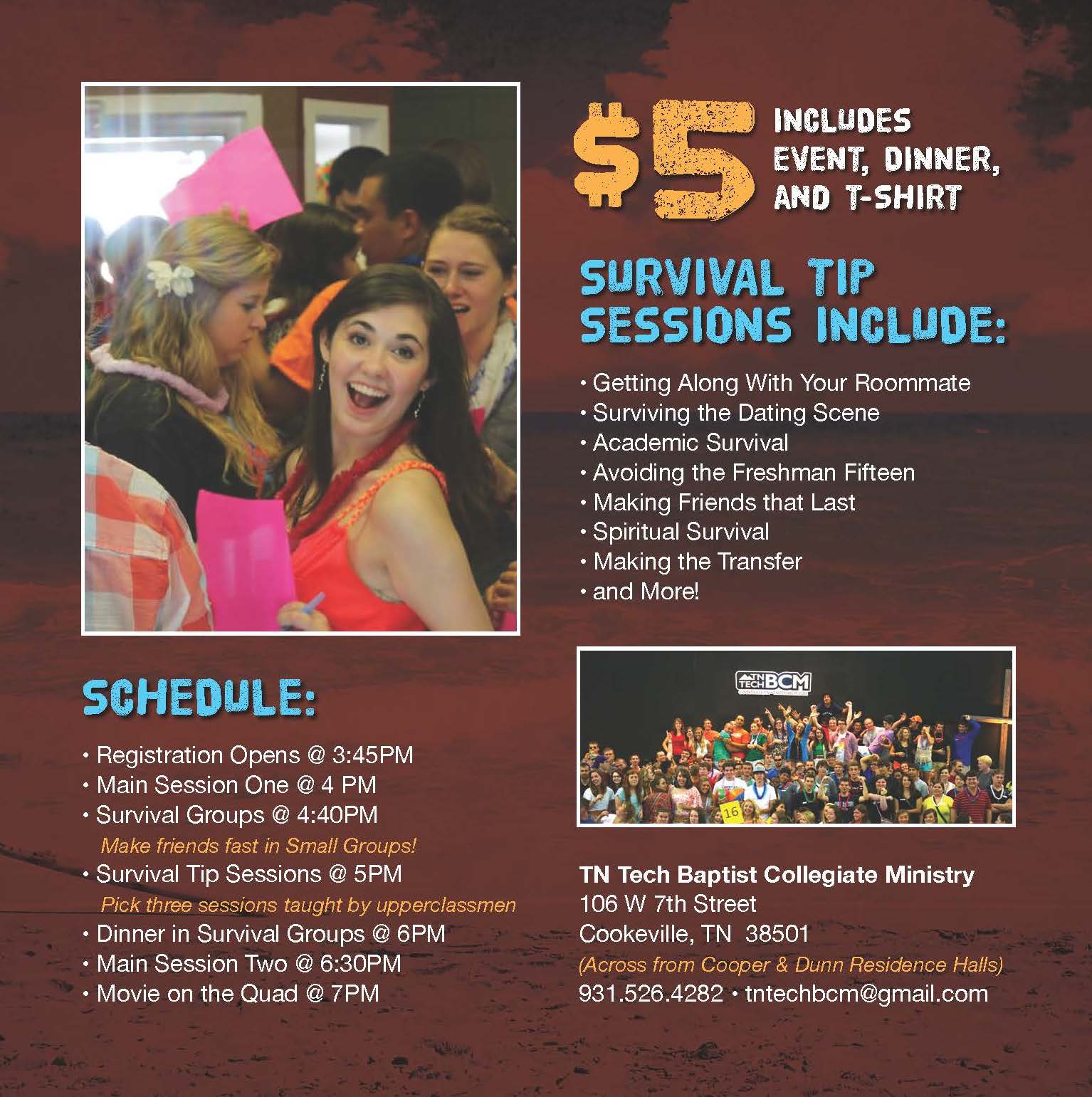 Freshmen Survival is the best way to get your college life off to a great start! You’ll make friends with freshmen and upperclassmen fast, find out about local church options, hear about all that the BCM has to offer you, and learn tips from upperclassmen on how to make it through your first year of college!